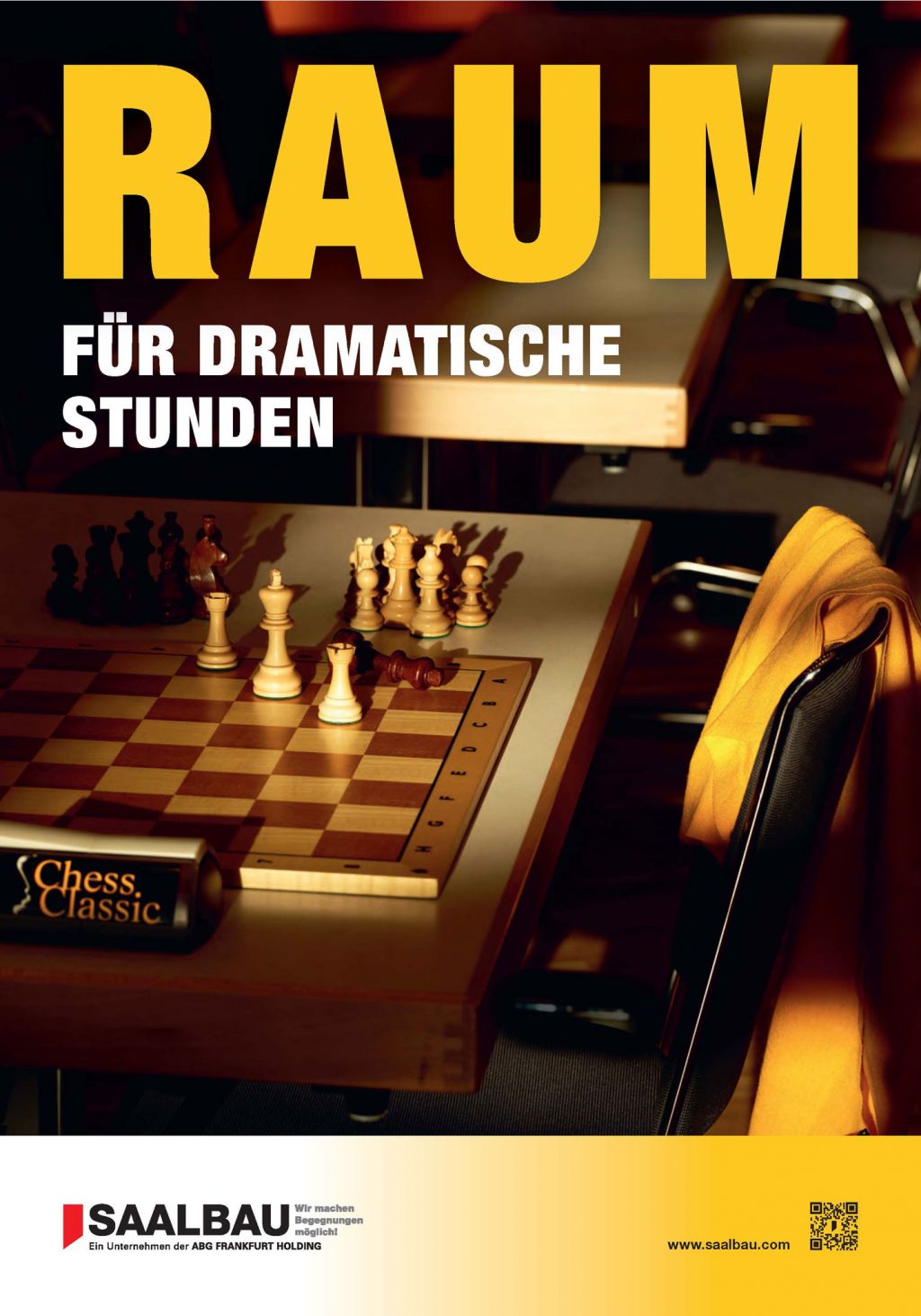 Auf dem gelbgerahmten Foto bildet ein Schachbrett, getaucht in dramatisches Licht, den Mittelpunkt. Dramatisch ist auch die Spielszene, gerade wurde der schwarze König schachmatt gesetzt. Dem unterlegenen Spieler ist es so warm geworden, dass er (oder sie?) den gelben Schal achtlos über die Stuhllehne geworfen hat.